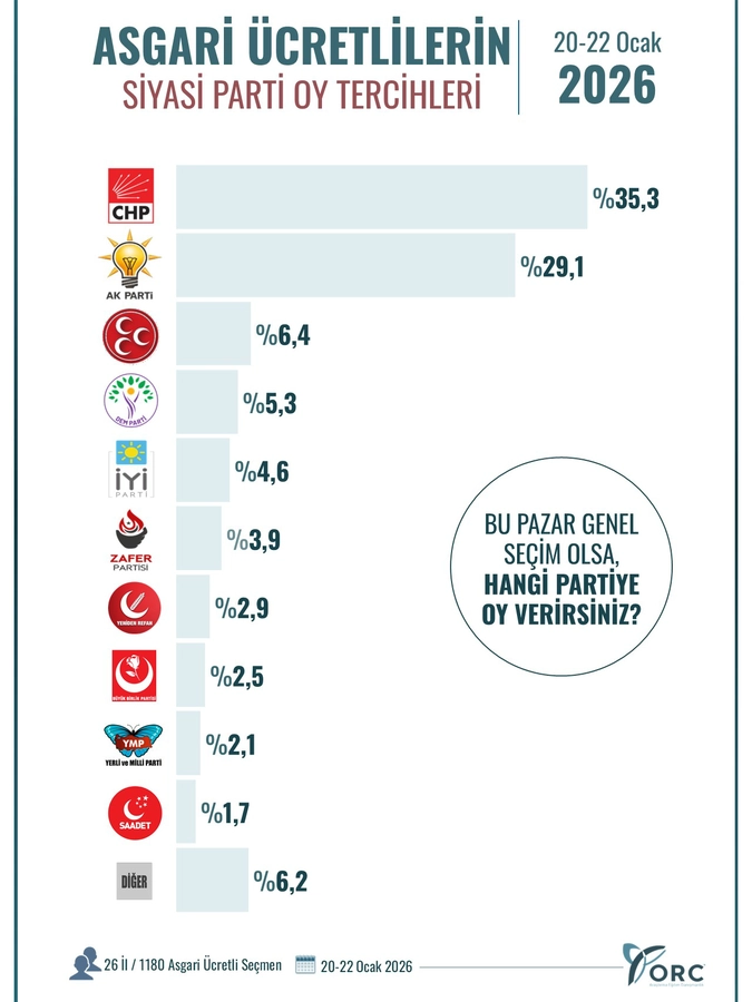 ORC Araştırma tarafından 20-22 Ocak 2026 tarihleri arasında gerçekleştirilen kamuoyu araştırmasında, asgari ücretle çalışanların siyasi parti oy tercihleri ölçüldü. Katılımcılara, “Bu pazar genel seçim olsa hangi partiye oy verirsiniz?” sorusu yöneltildi.