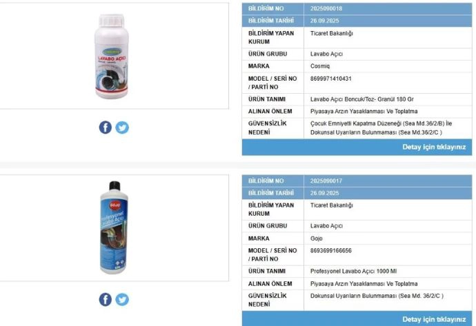 Ticaret Bakanlığı, piyasada bulunan ürünlere yönelik denetimlerini sürdürüyor. Bakanlık, "Güvensiz Ürün Bilgi Sistemi" üzerinden yaptığı duyuruda, Cosmiq ve Gojo markalarına ait iki temizlik ürününün tüketiciler için güvensiz ve sağlıksız olduğunu açıkladı.