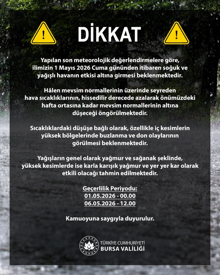 Valilikten yapılan açıklamada, yapılan son meteorolojik değerlendirmelere göre Bursa’nın 1 Mayıs 2026 Cuma gününden itibaren soğuk ve yağışlı havanın etkisi altına gireceği belirtildi.