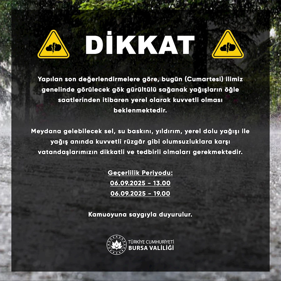 Valilikten yapılan açıklamada, 06 Eylül 2025 Cumartesi günü saat 13.00 ile 19.00 arasında geçerli olacak yağış uyarısına dikkat çekilerek, vatandaşların olası olumsuzluklara karşı tedbirli olmaları istendi.