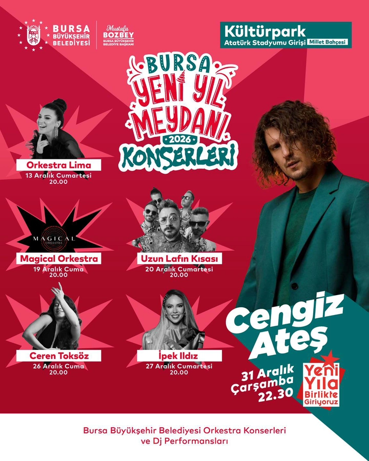 Yılbaşı gecesi ise coşku zirveye çıkacak. 31 Aralık Çarşamba günü saat 22.30’da Cengiz Ateş, Yeni Yıl Meydanı’nda Bursalılarla buluşacak.