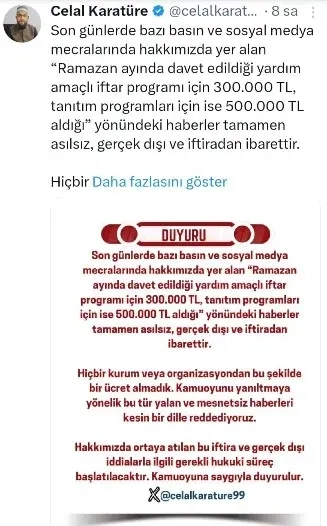 Hakkında çıkan haberlerde, Ramazan ayında katıldığı yardım amaçlı iftar programı için 300 bin TL, tanıtım programları için ise 500 bin TL ücret aldığı yönünde iddialar bulunduğunu belirten Karatüre, bu bilgilerin tamamen asılsız olduğunu ifade etti.