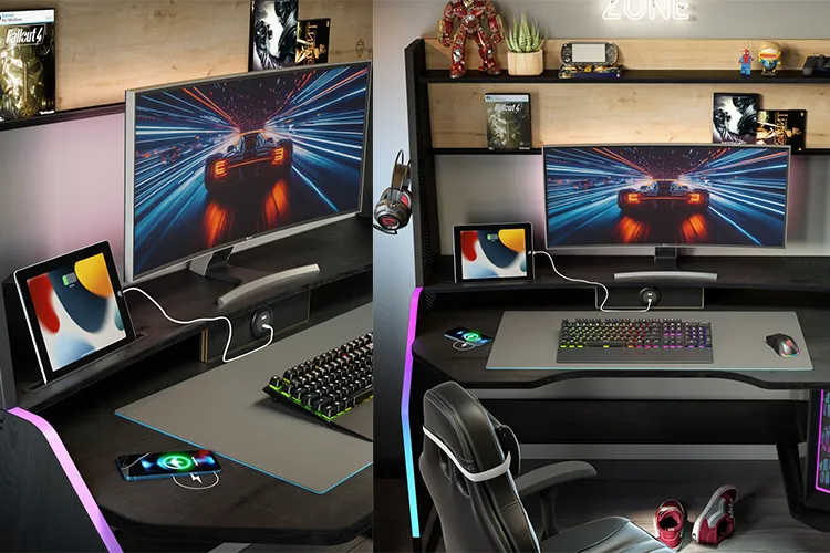 Masa üzerindeki USB portu (12V), hem USB Type-C hem de USB-A girişleriyle çeşitli cihazların kolayca şarj edilebilmesini sağlıyor. Yan panellerin ön kısmında yer alan uzaktan kumandalı RGB LED aydınlatma, oyun alanına tarz ve atmosfer katıyor.