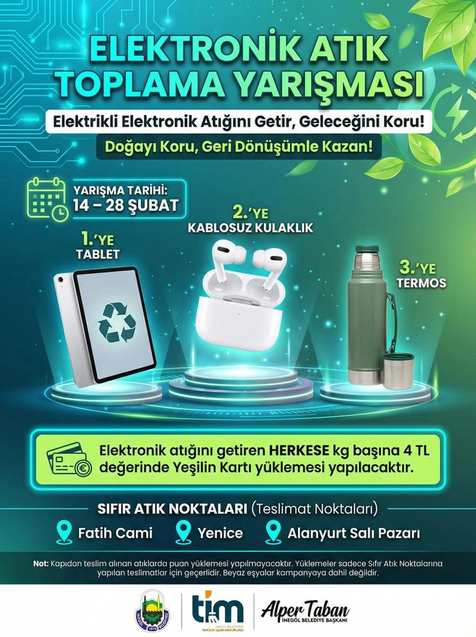 İnegöl Belediyesi, çevre bilincini artırmak ve geri dönüşüme katkı sağlamak amacıyla 14-28 Şubat tarihleri arasında Elektronik Atık Toplama Yarışması düzenlendiğini duyurmuştu. “Elektronik atık topla, geleceğini koru” ve “Doğayı koru, geri dönüşümle kazan” sloganlarıyla hayata geçirilen kampanya kapsamında en fazla elektronik atık getiren katılımcılar ödüllerin sahibi olacak.