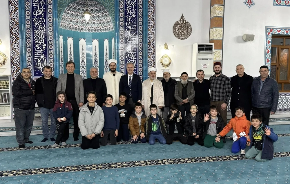 Teravih namazı için camiye gelen çocuklar, namaz sonrası Hafız Metin Çakar ve protokol üyeleriyle cami içerisinde söyledikleri ilahilerle geceye renk kattılar.