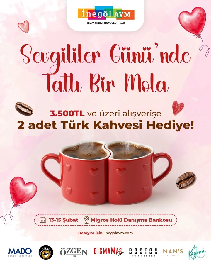 Kampanya kapsamında, 3.500 TL ve üzeri alışveriş yapan misafirlere, İnegöl AVM’nin kahve markalarından 2 adet Türk kahvesi hediye edilecek. Sevdikleriyle birlikte alışverişin ve paylaşmanın keyfini yaşamak isteyenler için kampanya, Sevgililer Günü atmosferini tatlandıracak.