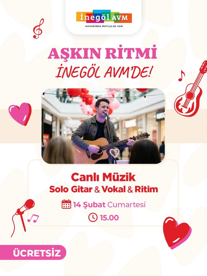 Kutlamalar, 14 Şubat 2026 Cumartesi günü saat 15.00’te gerçekleşecek canlı müzik etkinliği ile taçlanacak. Canlı müzik eşliğinde romantik ve keyifli anlar yaşamak isteyen ziyaretçiler, Sevgililer Günü’nü İnegöl AVM’de özel bir deneyime dönüştürebilecek.
