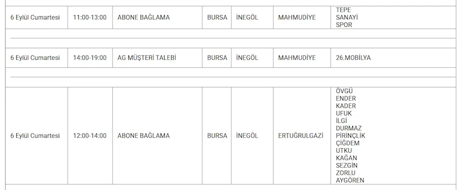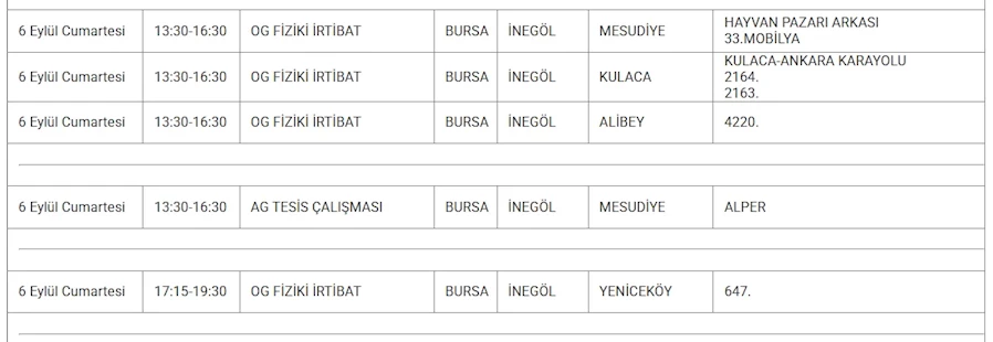 UEDAŞ tarafından paylaşılan kesinti listesine göre, 6 Eylül Cumartesi günü İnegöl'ün bazı mahallelerinde elektrik kesintisi uygulanacak. Açıklamaya göre, abone bağlama çalışmaları, ağ müşteri talebi ve trafo değişimi nedeniyle Mahmudiye, Ertuğrulgazi, Cerrah, Akhisar, Medusiye, Yeniceköy, Alibey ve Kulaca mahallelerinde belirli saatler arasında elektrik verilemeyecek.