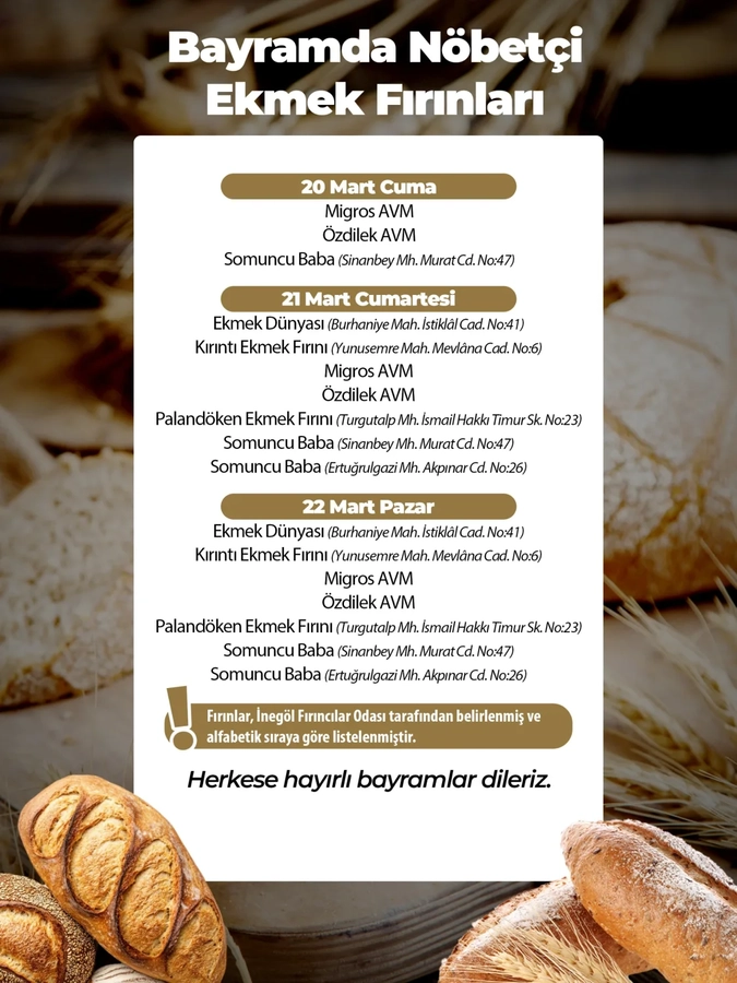 İnegöl Belediyesi’nden konuya ilişkin yapılan açıklamada şu ifadelere yer verildi: “Fırıncılar Odası ile yaptığımız istişareler neticesinde bayram süresince fırınların kapalı olması kararlaştırılmıştır. Ancak vatandaşlarımızın mağduriyet yaşamaması adına ekmek ihtiyacını karşılayabilmek için 3 gün boyunca nöbetçi fırın uygulamasına gidilecektir. Nöbetçi olarak hizmet verecek fırınlar ise Fırıncılar ve Benzerleri Odası tarafından belirlenmiştir.”