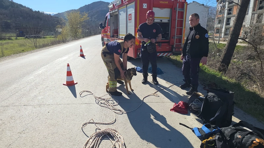 Yaklaşık 6 metre derinliğindeki dere yatağında mahsur kalan köpeğin kurtarılması için bölgeye gelen ekipler çalışma başlattı.