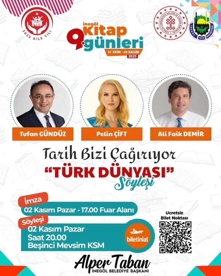 Kitap Günlerinin ilk hafta sonunda 01 Kasım Cumartesi ve Pazar günleri Beşinci Mevsim Kültür Sanat Merkezinde 2 özel söyleşi programı düzenlenecek. 01 Kasım Cumartesi günü Yazar Saliha Erdim, “Ailede Rol Dağılımı ve Sorumluluklar” konulu söyleşisiyle İnegöl 9. Kitap Günlerinin konuğu olacak. 20.00’da Beşinci Mevsim Kültür Sanat Merkezinde yapılacak söyleşide aile üzerine samimi bir sohbet ve gönüllere dokunan bir buluşma yaşanacak. 02 Kasım Pazar günü ise İnegöllüler tarih ve kültür dolu bir akşamda bir araya gelecek. Tufan Gündüz, Pelin Çift ve Ali Faik Demir, “Tarih Bizi Çağırıyor: Türk Dünyası” konulu söyleşileriyle İnegöl 9. Kitap Günleri kapsamında 20.00’da Beşinci Mevsim Kültür Sanat Merkezinde İnegöllülerle buluşacak. Her iki program da ücretsiz biletli olarak gerçekleştirirken, biletler biletinial.com üzerinden alınabilecek.