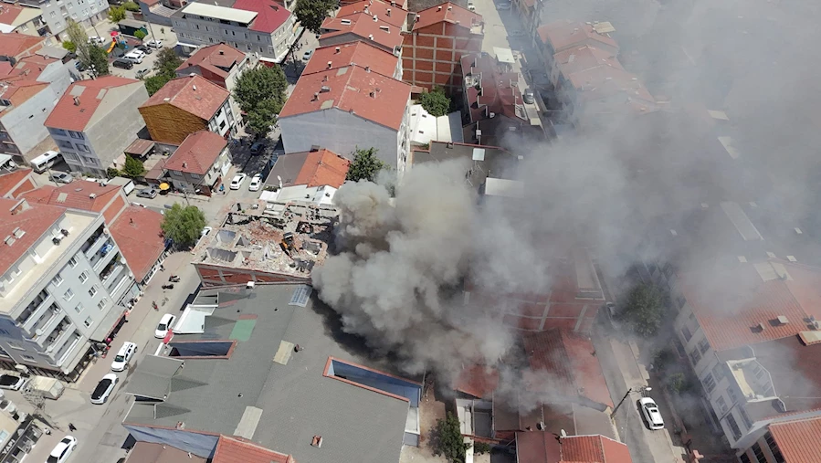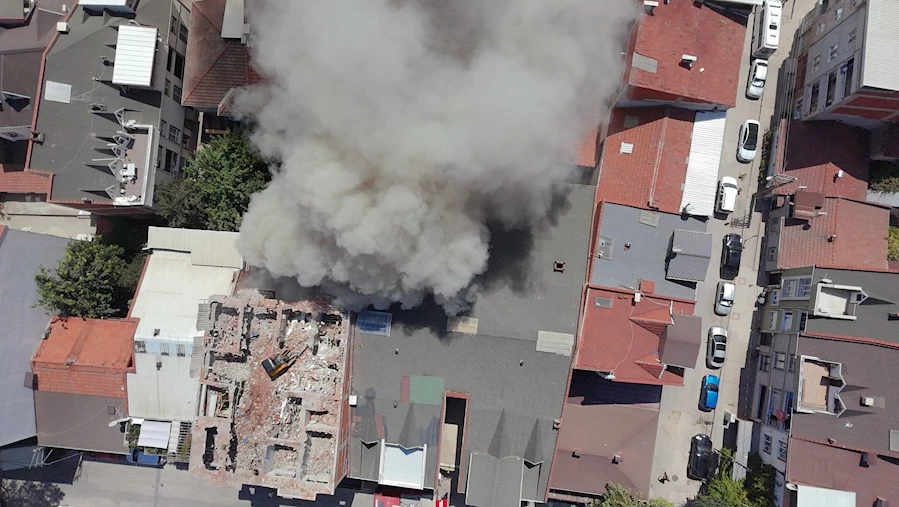 Yıkım ekiplerinin çalışmaları sırasında, binanın arka tarafında biriken hurdalık ve çöpler, henüz belirlenemeyen bir nedenle alev aldı. Kısa sürede büyüyen yangının dumanı metrelerce yükselerek uzaktan görüldü.