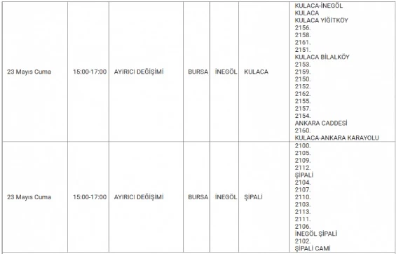 İnegöl'de yarın (23 Mayıs Cuma) iki kırsal mahallede planlı elektrik kesintisi yapılacak.