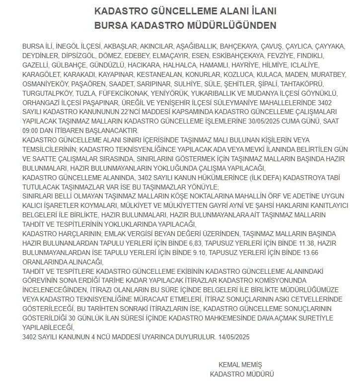 Bursa Kadastro Müdürlüğü, 30 Mayıs 2025 tarihinden itibaren İnegöl’e bağlı mahallelerde kadastro güncelleme çalışmalarına başlanacağını duyurdu. Çalışmalar kapsamında, taşınmaz sahiplerinin belirlenen tarih ve saatte taşınmazlarının başında hazır bulunmaları istendi.