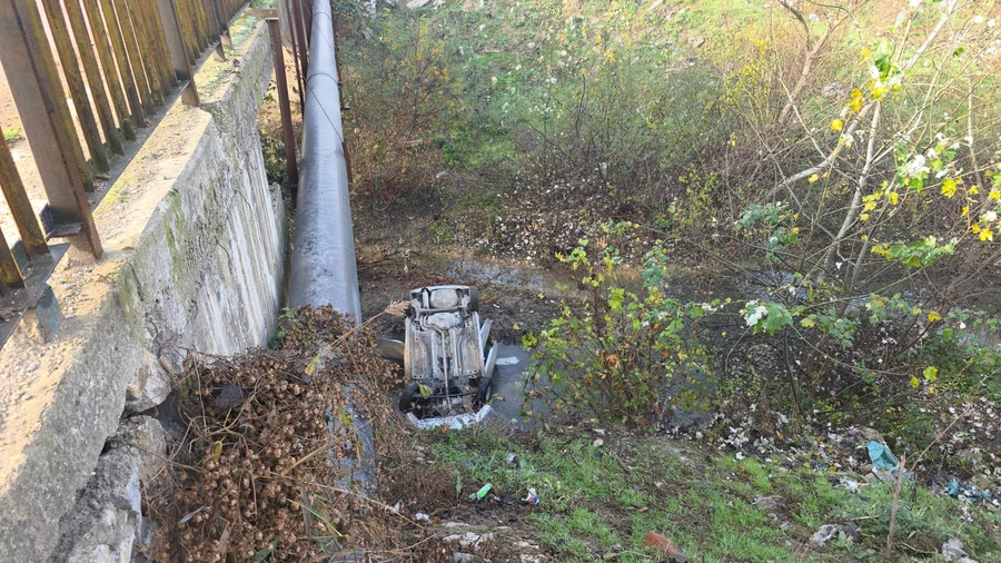 Araç ters şekilde dere yatağında dururken, sürücü otomobilde sıkıştı.