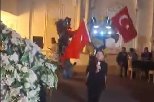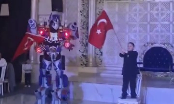 Cemiyette sahneye dev robot kostümleriyle çıkan ekip, ellerinde Türk bayraklarıyla salona giriş yaptı. O anlar davetliler tarafından uzun süre alkışlandı.