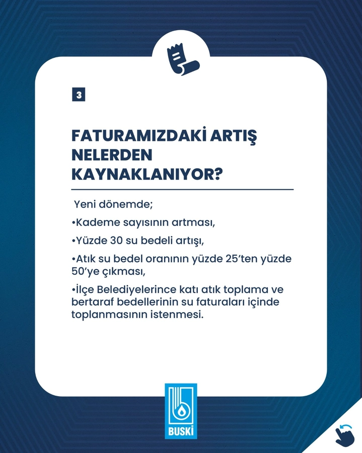 BUSKİ ayrıca, su tarifelerine ilişkin merak edilen konuların “9 soruda 9 cevap” başlığı altında detaylandırıldığını duyurdu. Bu bilgilendirme ile vatandaşların su faturaları, hizmet kalitesi ve altyapı yatırımlarıyla ilgili sorularına açıklık getirilmesi amaçlandı.