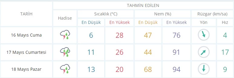 Yarın (Cumartesi) şiddetli sağanak etkili olacak. En düşük sıcaklık 11, en yüksek sıcaklık 26 derece.
