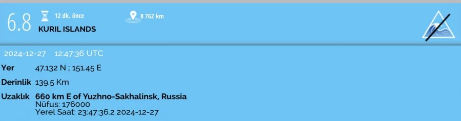 Rusya'nın Kuril Adası'nda 6.8 büyüklüğünde deprem meydana geldi.