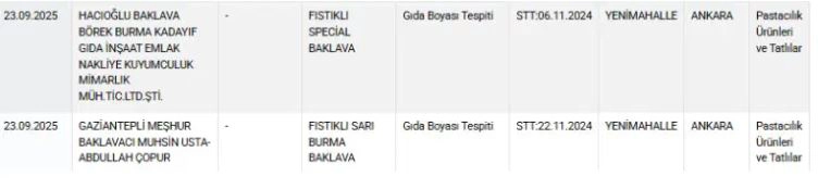 Hacıoğlu Baklava: “Fıstıklı Special Baklava” ürününde gıda boyası tespit edildi. Parti/Seri No: STT: 06.11.2024 – İl/İlçe: Ankara/Yenimahalle.