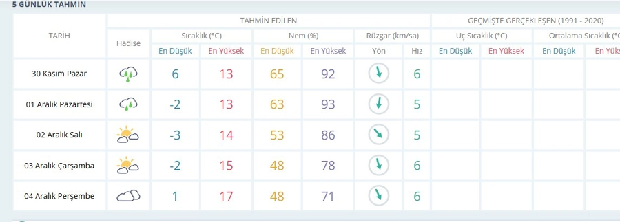 1 Aralık Pazartesi: -2°C / 13°C -Yağmurlu