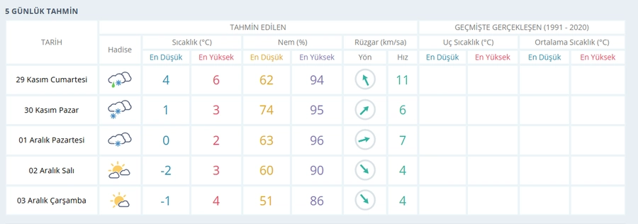 30 Kasım Pazar: -1°C / 3°C -Kar
